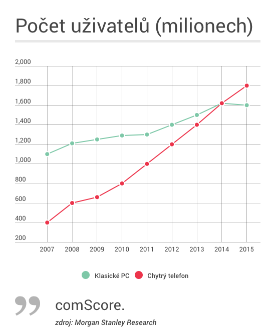 Počet uživatelů chytrých telefonů vs. klasickým počítačům