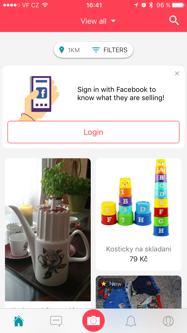 Letgo sází na vaši zvědavost a tak vám při prvním spuštění nabídne seznam nejbližších nabídek k prodeji. Až poté, co si projdete nabídky, se můžete zaregistrovat pomocí Facebooku jedním stisknutím.