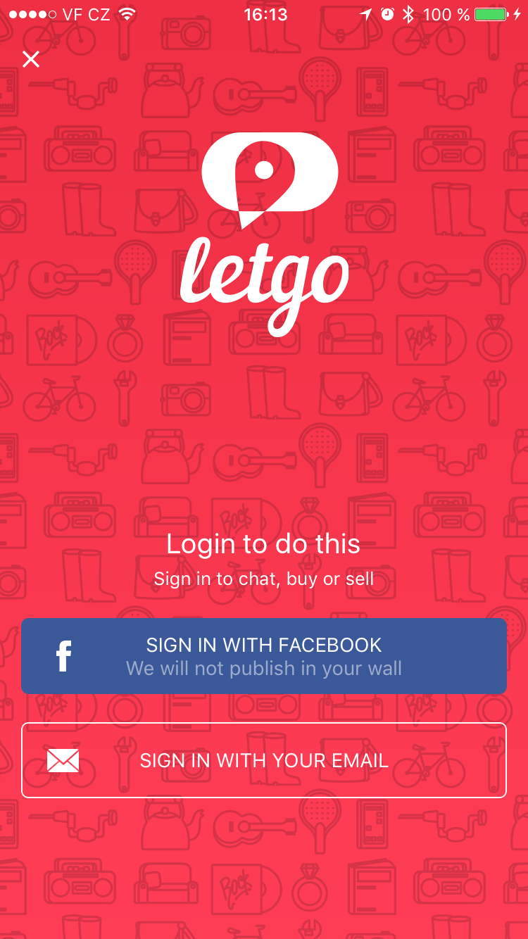 Letgo přihlašovací obrazovka přihlášení pomocí Facebooku