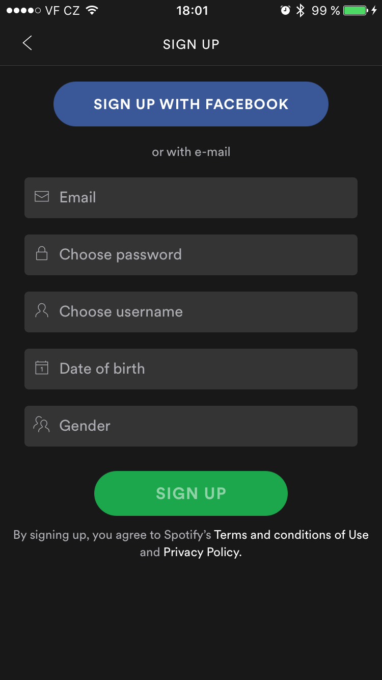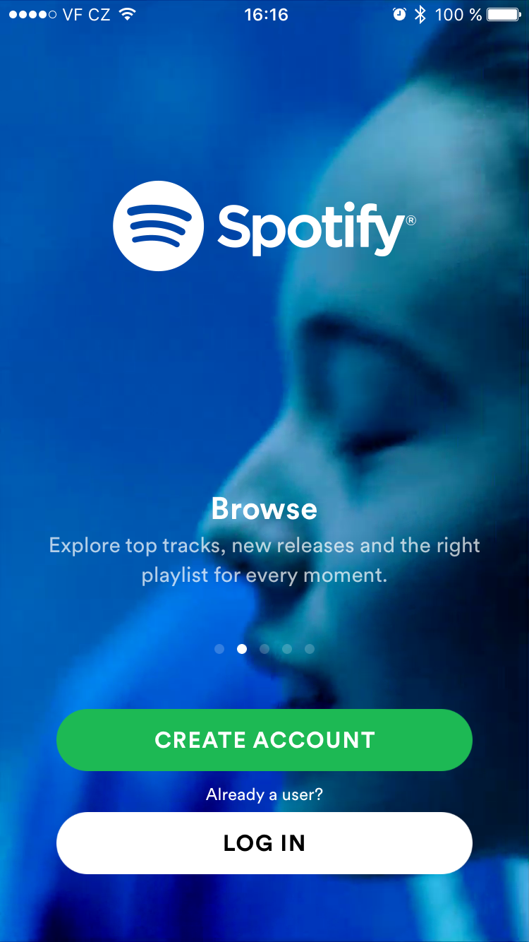Spotify má snad nejhezčí a nejzajímavější přihlašovací obrazovku, co jsem v poslední době viděl. Nejlepší je její jednoduchost a přehlednost. Pokud se rozhodujete registrovat, ukáže vám jednoduché důvody proč aplikaci používat.