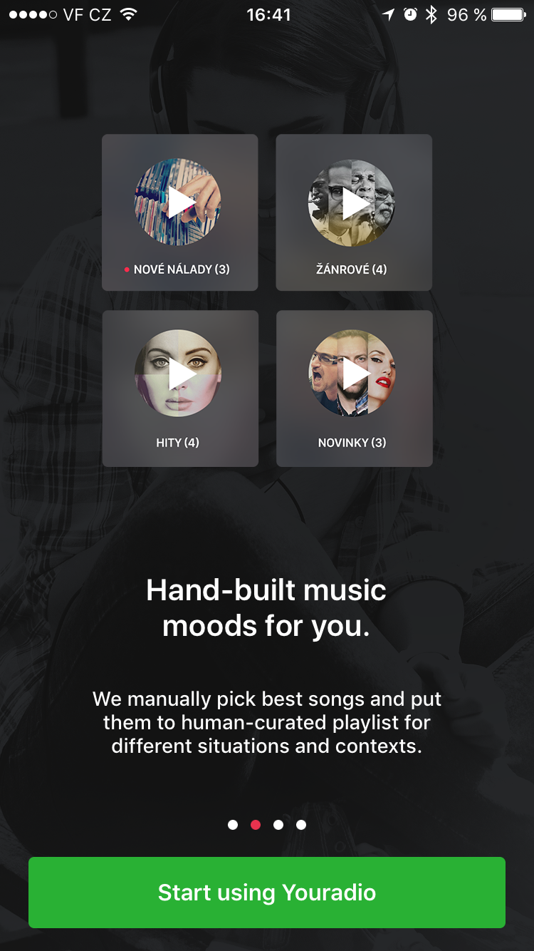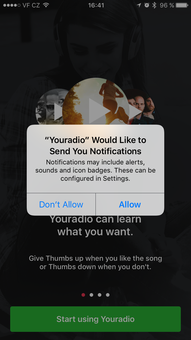 Youradio vás ihned po prvním spuštění vyzve k povolení zasílání notifikačních zpráv, poté vám nabídne důvody, proč aplikaci používat a teprve poté se můžete registrovat.